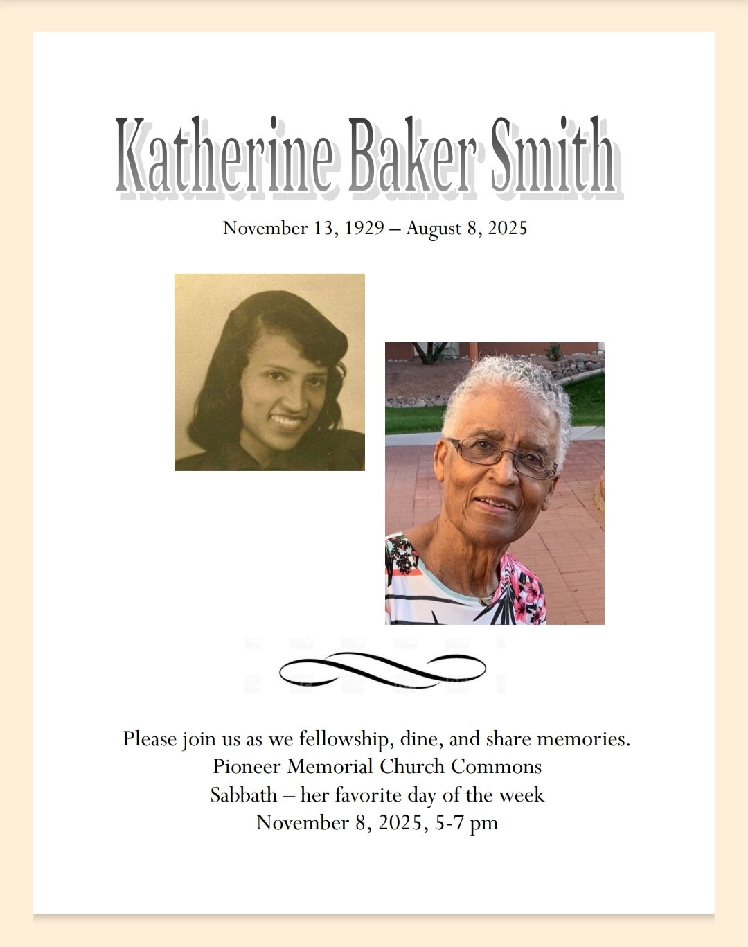We are saddened to share that Katherine Smith, 95, passed away on August 8, 2025, in Mesa, AZ, from complications of Alzheimer's. A former Associate Dean of Women and Pioneer Memorial Church co-Head Elder, she was a fixture in the Berrien Springs community for over 50 years. An informal Celebration of Life will be held at the Pioneer Memorial Church Commons on Saturday, November 8, 2025, from 5-7 PM. Please join us as we share fond memories and  fellowship together while enjoying a light supper. Share your favorite memory with Susie at livrefou@hotmail.com. In lieu of flowers, please contribute to Neighbor to Neighbor at https://www.n2nhelps.com.