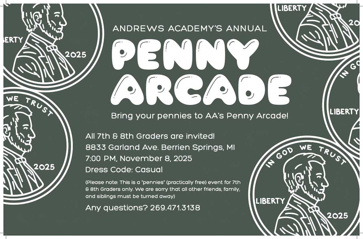 Andrews Academy invites all seventh and eighth graders to Penny Arcade, Saturday night Nov. 8, 2025. This is a fun evening of games, activities & food; all for just pennies. Get to know Andrews Academy students better as you and your seventh & eighth grade friends enjoy Penny Arcade from 7 - 9 PM. Due to costs, we can only open this to 7th & 8th graders & Andrews Academy students, this is not open to siblings and families. Parents can drop your child off at 7:45 PM and pick them up at 9 pm. If you have any questions please contact the school at 269-471-3138.