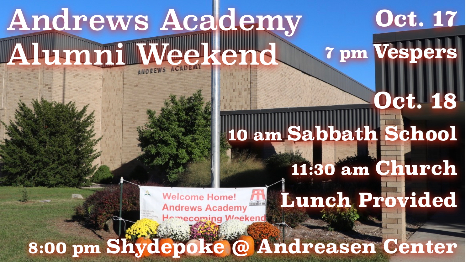 Andrews Academy invites you to ALUMNI WEEKEND, October 17-19, 2025. Come and reunite with your AA family. Remember the defining moments of your past and reconnect with old friends. We look forward to seeing all of you once again at our Alumni Reunion! (All are invited, this year’s honored classes end in 5 and 0).