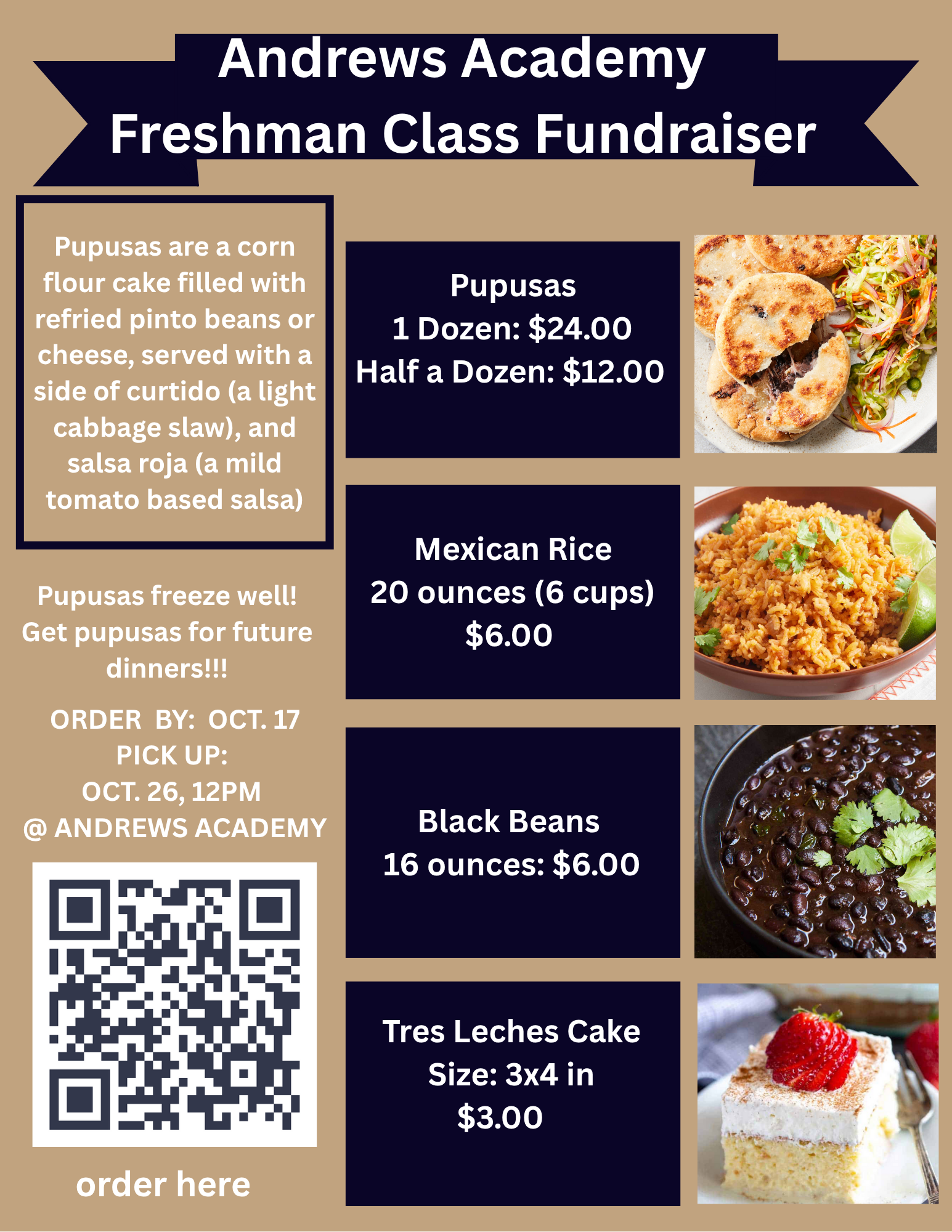 Please, support the AA Freshman class by ordering pupusas and more by October 17th. Pupusas freeze well! Order for future dinners!!!