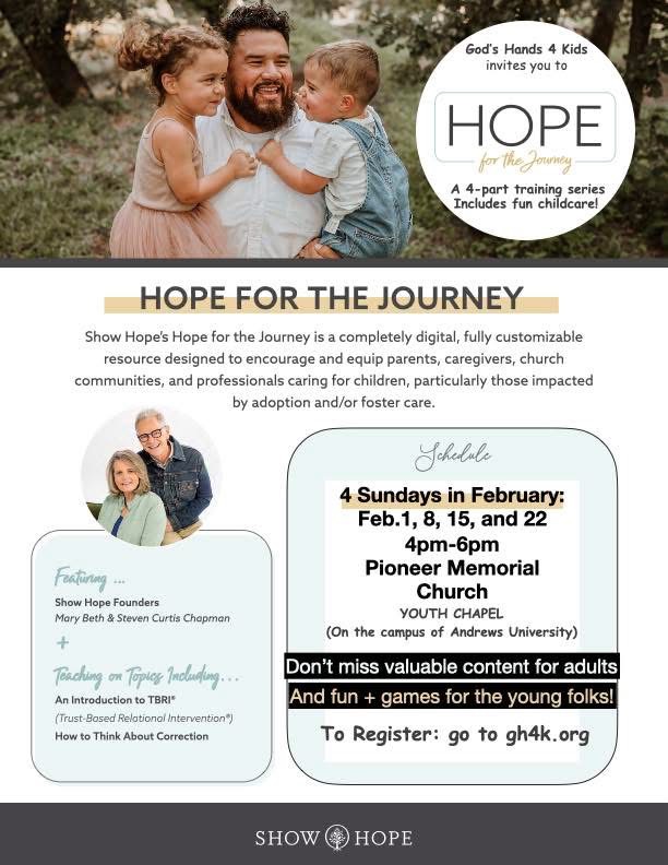 God's Hands 4 Kids, a PMC Grow Group outreach to our community serving foster, adoptive, kinship and guardianship families partnering with Berrien County Department Of Health and Human Services. As a gift to the families served by them and as a gift to the community of ministry leaders and professionals, we will be providing Hope for the Journey, a video conference on Trust Based Relational Intervention - trauma, on Sunday afternoons in February here at PMC. It is produced by Show Hope. For more information and to register go to our website GH4K.org