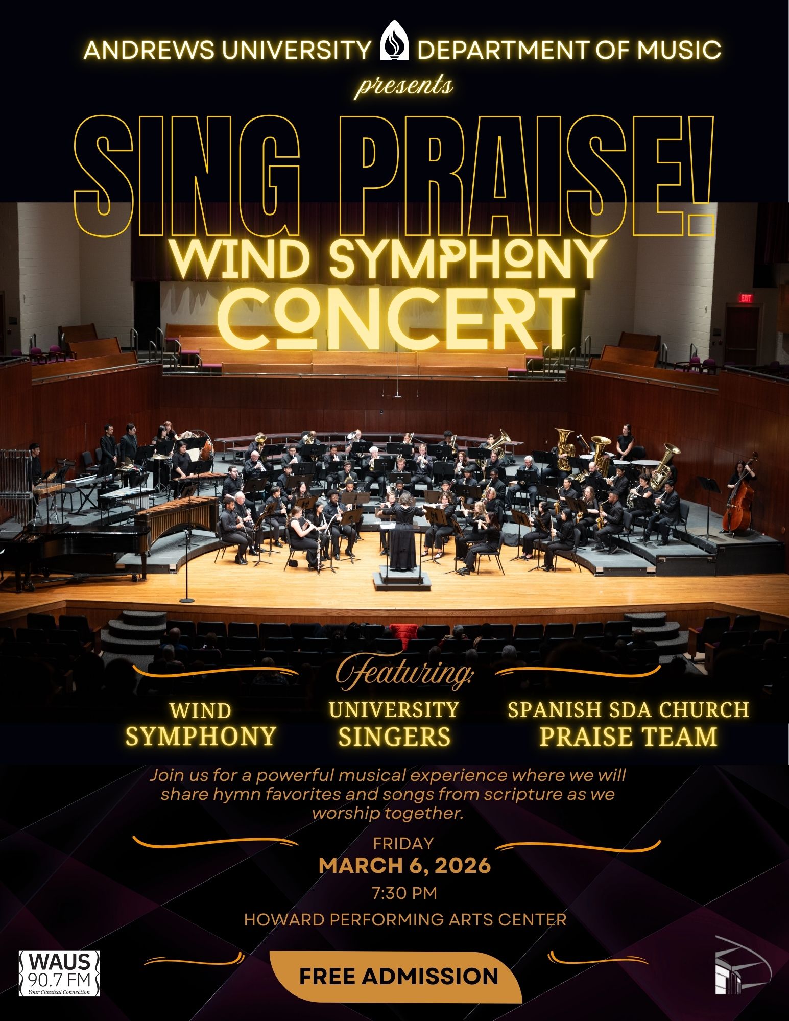 “Sing Praise!” Wind Symphony Vespers is quickly becoming an annual tradition, inviting audiences to experience the joy of music-making through both listening and singing together. This year’s event brings the Wind Symphony together with the University Singers and the Spanish SDA Church Praise Team, creating a powerful shared musical experience. This year’s program features beloved hymn favorites such as “Rejoice the Lord Is King” and “Lead On, O King Eternal,” alongside contemporary works inspired by texts from the Psalms and other scriptures. Bring a friend or family member and join the Wind Symphony for this meaningful and uplifting evening on Friday, March 6, 2026, at 7:30 PM, in the Howard Performing Arts Center. Admission is free.